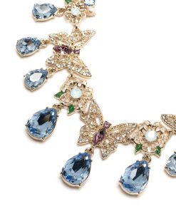 The Butterfly Drama Necklace alternates between golden floral charms and crystal-embellished butterflies. Mauve stones sit at the center of each butterfly charm. Sky blue teardrop stones fall from the necklace like rain amongst a spring garden. The statement gold necklace is featured in a gold tone with gold hardware and measures 16 inches in length with four length options.