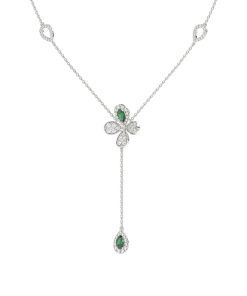 The Floral White Gold Y Necklace is an 18 karat white gold delicate chain with a diamond and natural emerald four-leaf clover at its center. A delicate teardrop-shaped diamond pavé emerald holds onto the clover by a white gold chain.