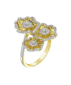 The Halo Flower Yellow Gold Ring features a yellow gold band set with natural diamonds and complete with a trio of yellow gold and natural diamond camellia-inspired flowers.