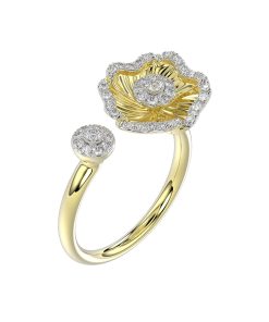The Halo Flower Yellow Gold Ring features a yellow gold open band complete with a yellow gold and natural diamond camellia-inspired flower on one end and a single diamond on the opposing end.