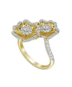 The Halo Flower Yellow Gold Ring features a yellow gold band set with natural diamonds and complete with a duo of yellow gold and natural diamond camellia-inspired flowers.