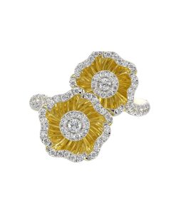 The Halo Flower Yellow Gold Ring features a yellow gold band set with natural diamonds and complete with a duo of yellow gold and natural diamond camellia-inspired flowers.