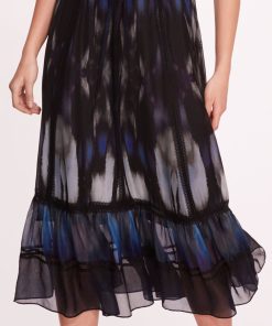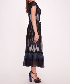 The Abstract Viscose Midi Dress exudes effortless charm with its v-neck design and abstract print on silk viscose fabric. Featuring ruffle sleeves and tiered hem ruffles, it strikes the perfect balance between elegance and modernity. The drawstring waist allows for a customizable fit, while delicate trim details add a touch of sophistication, making it an ideal choice for both casual outings and special occasions.