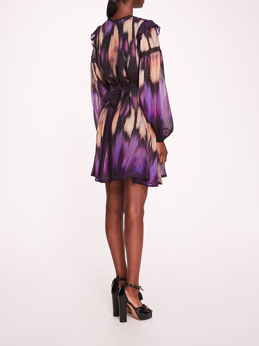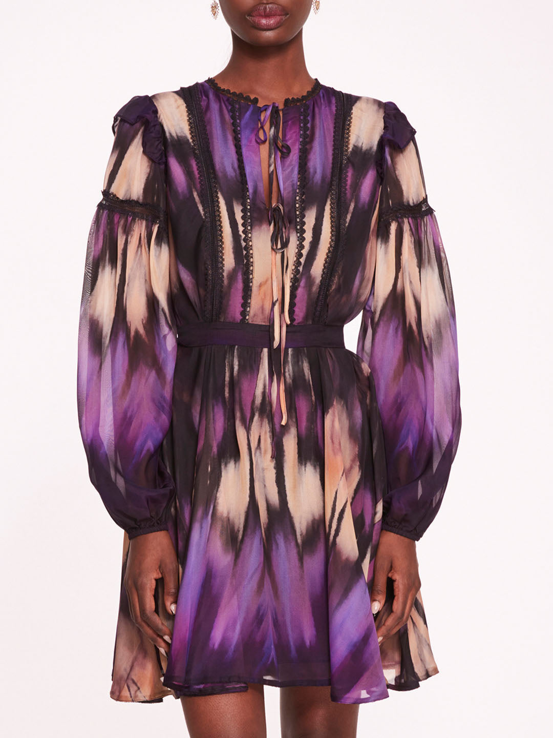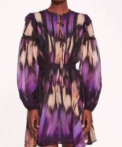 The Abstract Viscose Mini Dress is a chic and playful ensemble, featuring an a-line silhouette and a flattering v-neck design in abstract printed silk viscose. Its billowy sleeves and waist tie add a touch of femininity and versatility to the look, while delicate lace trims offer a hint of elegance.