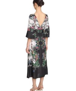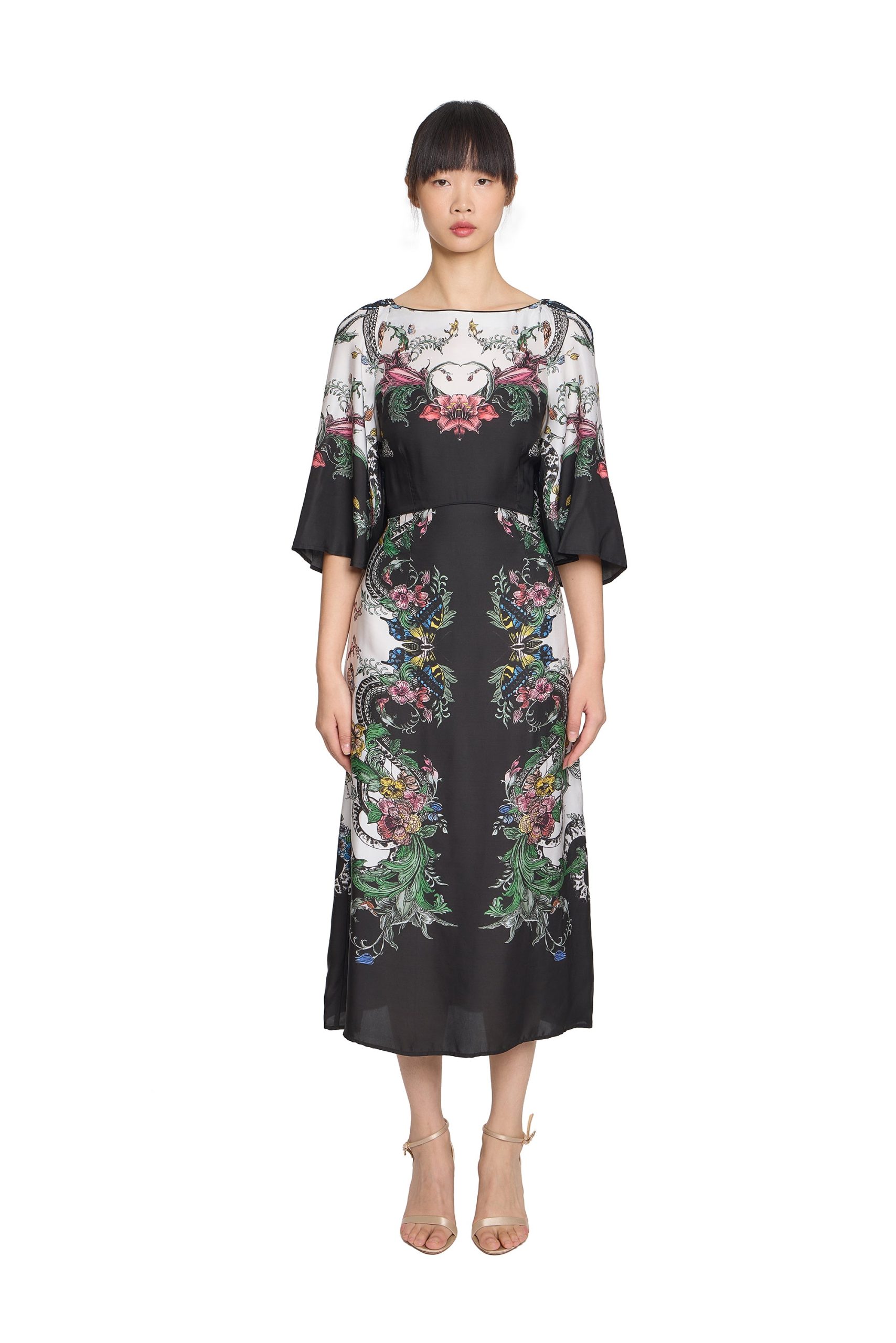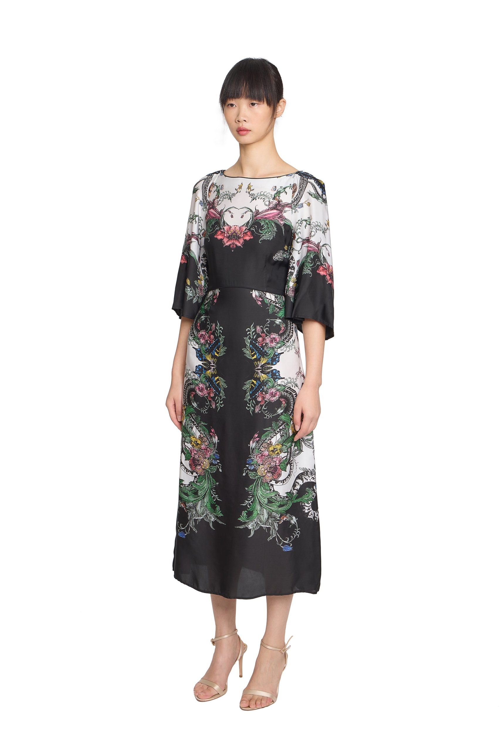Crafted from viscose twill and chiffon with corded piping, the Billowy Twill Empire Dress features an empire A-line silhouette, high neckline, billowy sleeves, and finished with refined accent piping.