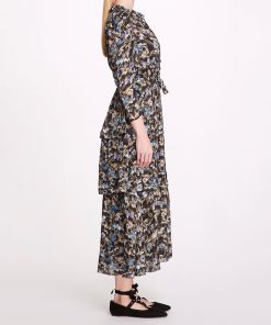 The Juniper midi dress features a muted garden printed on delicately draped viscose. The 3-tiered embroidered dress is complete with picot edging and a dainty bow at the neckline.