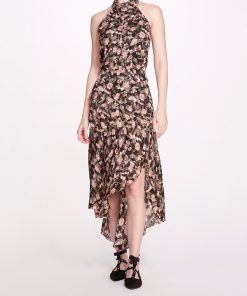 An enchantment of florals, this printed viscose dress features a halter neckline with cascading ruffles and picot edging.