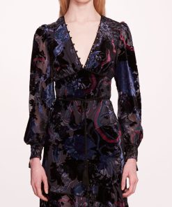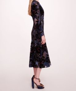 The Velvet Burnout Midi Dress features a v-neckline and long cuffed sleeves for a sophisticated look. The flared skirt adds movement and grace, while metal bobble buttons and cuff tassels provide unique detailing. A separate rope tassel belt completes the look.