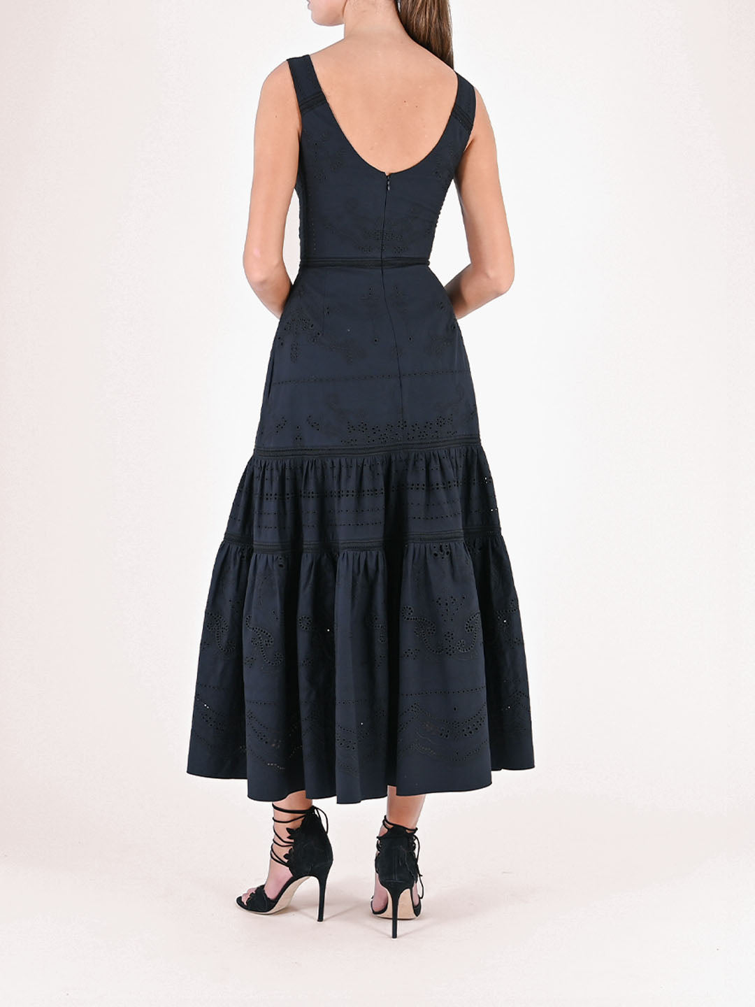 The Voile Tiered Maxi Dress features a tiered a-line silhouette with a sleeveless bodice and scoop neckline. Crafted from cotton broderie angliase, this crisp lightweight dress is complete with woven lattice trim details.