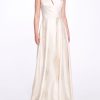 The Barletta gown is a one-shoulder a-line gown. The novelty brocade fabric emits a soft luminescence, making the monochromatic floral pattern pop. The dress is complete with a double spaghetti strap and keyhole detail on the bodice.