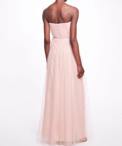 Modern romance becomes an effortless reality in the Imola gown in blush. Featuring an amorous pleated bodice, a lush ribbon belt at the waist, and a soft, sweetheart neckline, this dress is refined and charming.