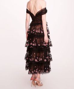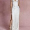 The Calathea Gown is a strapless gown designed with calathea cloqué detailed on 4-way stretch crepe. The ballgown features a high slit and dramatic bow.