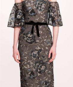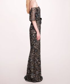 Embrace effortless elegance with the Climbing Vines Gown, featuring an off-the-shoulder silhouette and intricate sequin floral embroidery on airy tulle. This enchanting column dress flows gracefully, highlighting your figure while adding a touch of whimsy and sparkle.