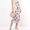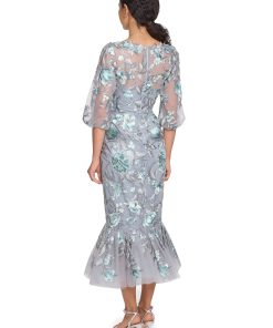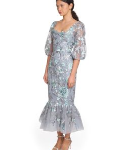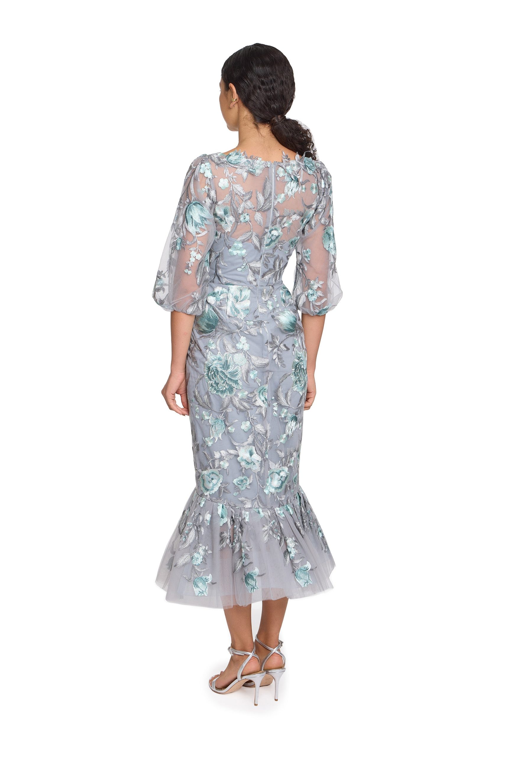 The Embroidered Puff Sleeve Midi Dress features delicate tulle puff sleeves and a sophisticated square neckline. Craft with delicate tulle, the fit-to-flare cocktail dress is meticulously embroidered with 3D floral embroidery.