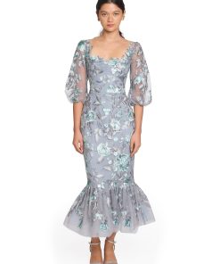 The Embroidered Puff Sleeve Midi Dress features delicate tulle puff sleeves and a sophisticated square neckline. Craft with delicate tulle, the fit-to-flare cocktail dress is meticulously embroidered with 3D floral embroidery.