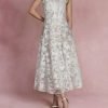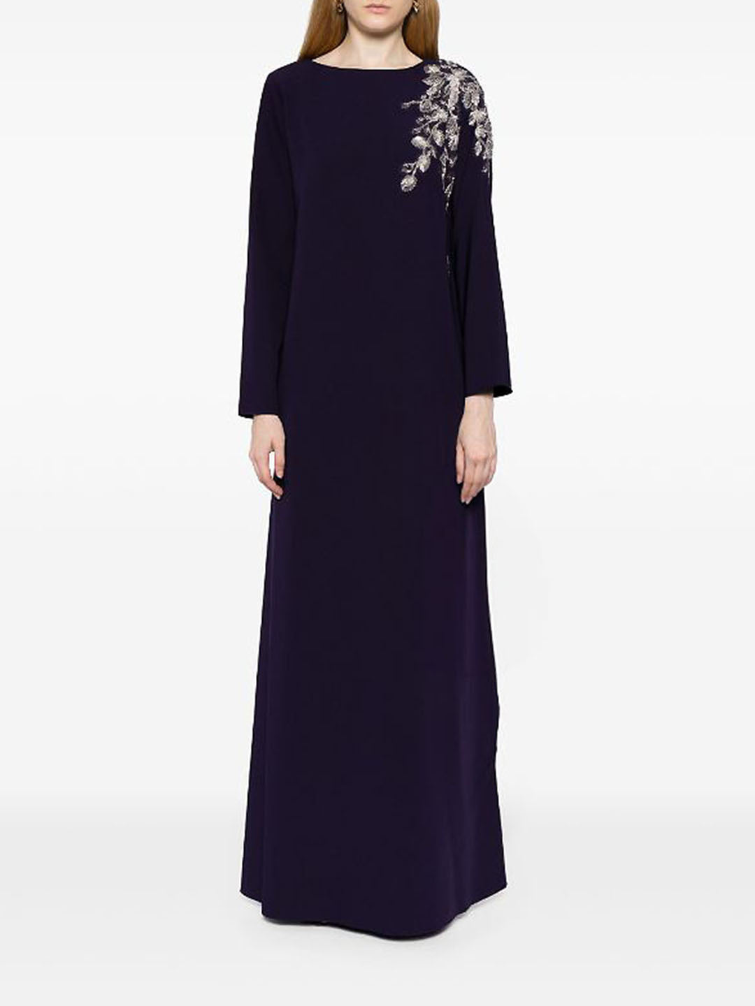 The Floral Embroidered Kaftan features a flowing column silhouette, modest sleeve and neckline, and budding white floral embroidery across the bodice.
