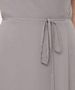 The Sessa gown in gunmetal blurs the line between geometric and organic shapes. The v–neck drape halter gown features a triangular cutout on the back, a single mid-thigh leg slit, and finished with an elongated waist tie to give notice to the natural curve of your figure.