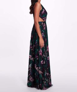The definition of charm, this floor-length gown in black features a sleeveless deep v-neckline, a keyhole back detail, and a bodice cut-out detail.