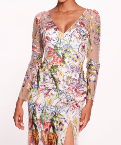 The Ribbons Long Sleeve Gown is a long sleeved v-neck gown with a fit-to-flare silhouette and slit on degrade embroidered tulle.