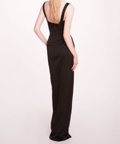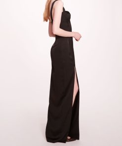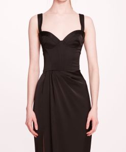 Make a bold statement in the Satin Bustier Gown, featuring a sleeveless design and exquisite bustier detailing. The sleek satin fabric is complemented by elegant ruched draping, creating a flattering and sophisticated look.