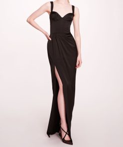 Make a bold statement in the Satin Bustier Gown, featuring a sleeveless design and exquisite bustier detailing. The sleek satin fabric is complemented by elegant ruched draping, creating a flattering and sophisticated look.