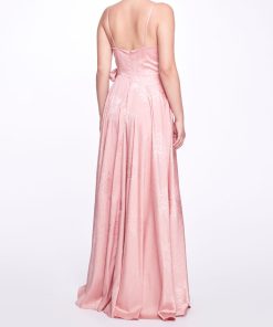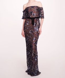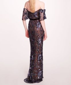The Sequin Lattice Cape Gown features a stunning floor-length cape, adorned with intricate geometric floral lattice detailing. The combination of shimmering sequins and dramatic cape creates a bold yet elegant look, perfect for making a statement at any gala or formal event.