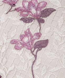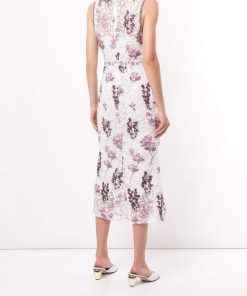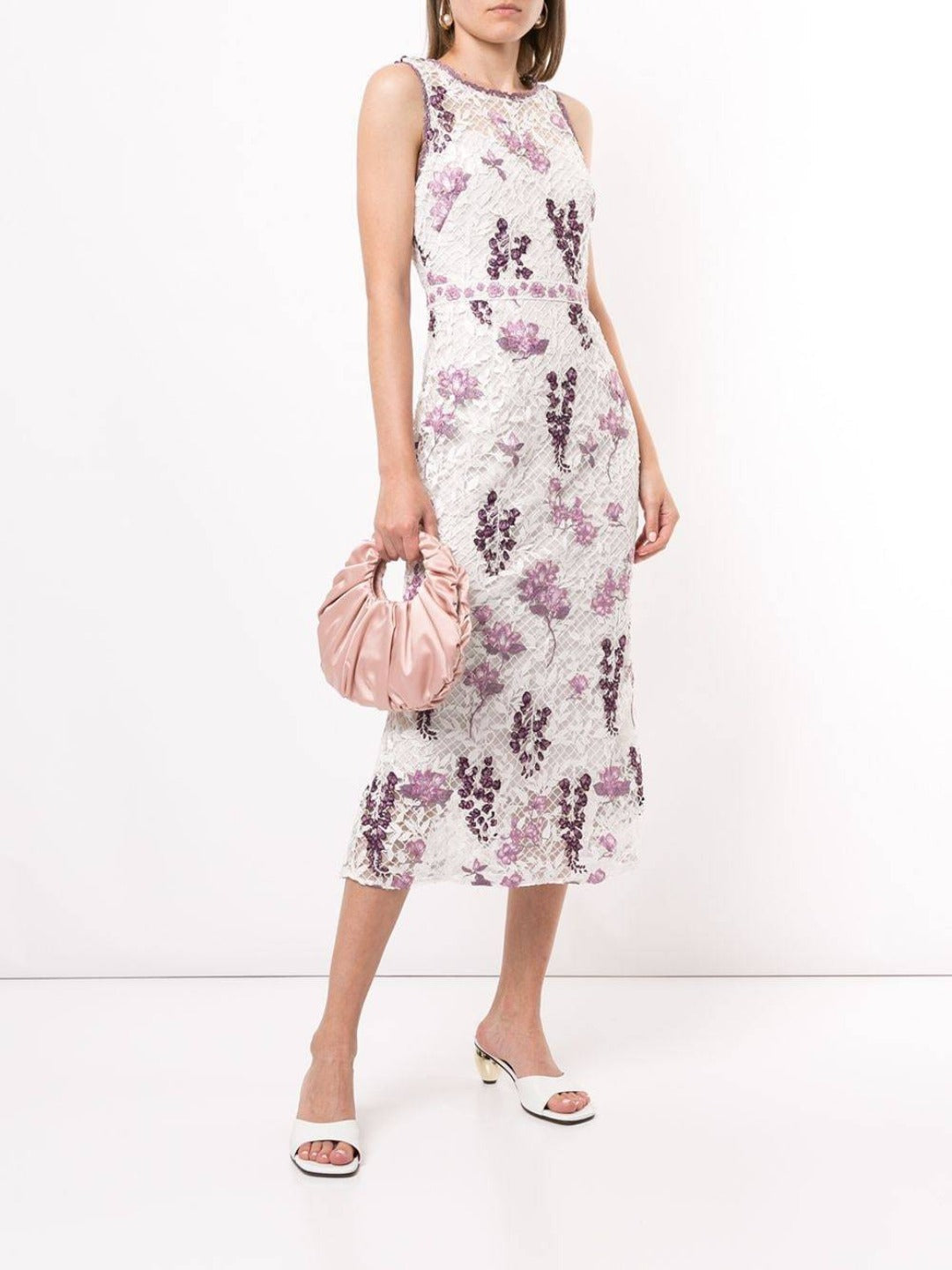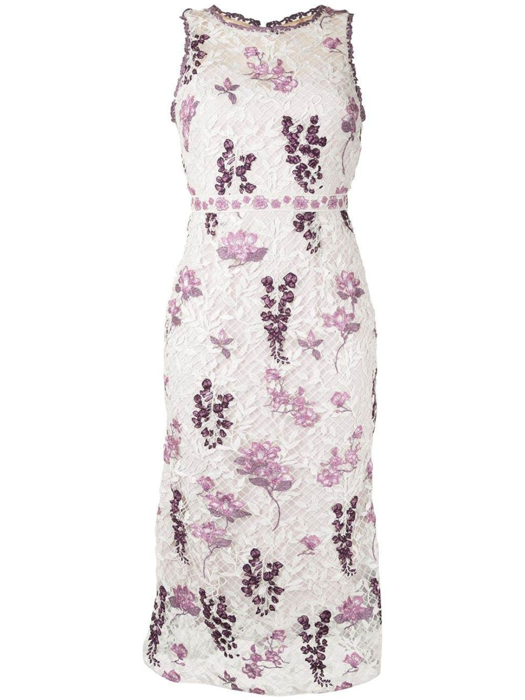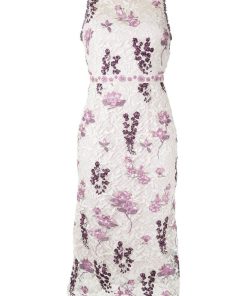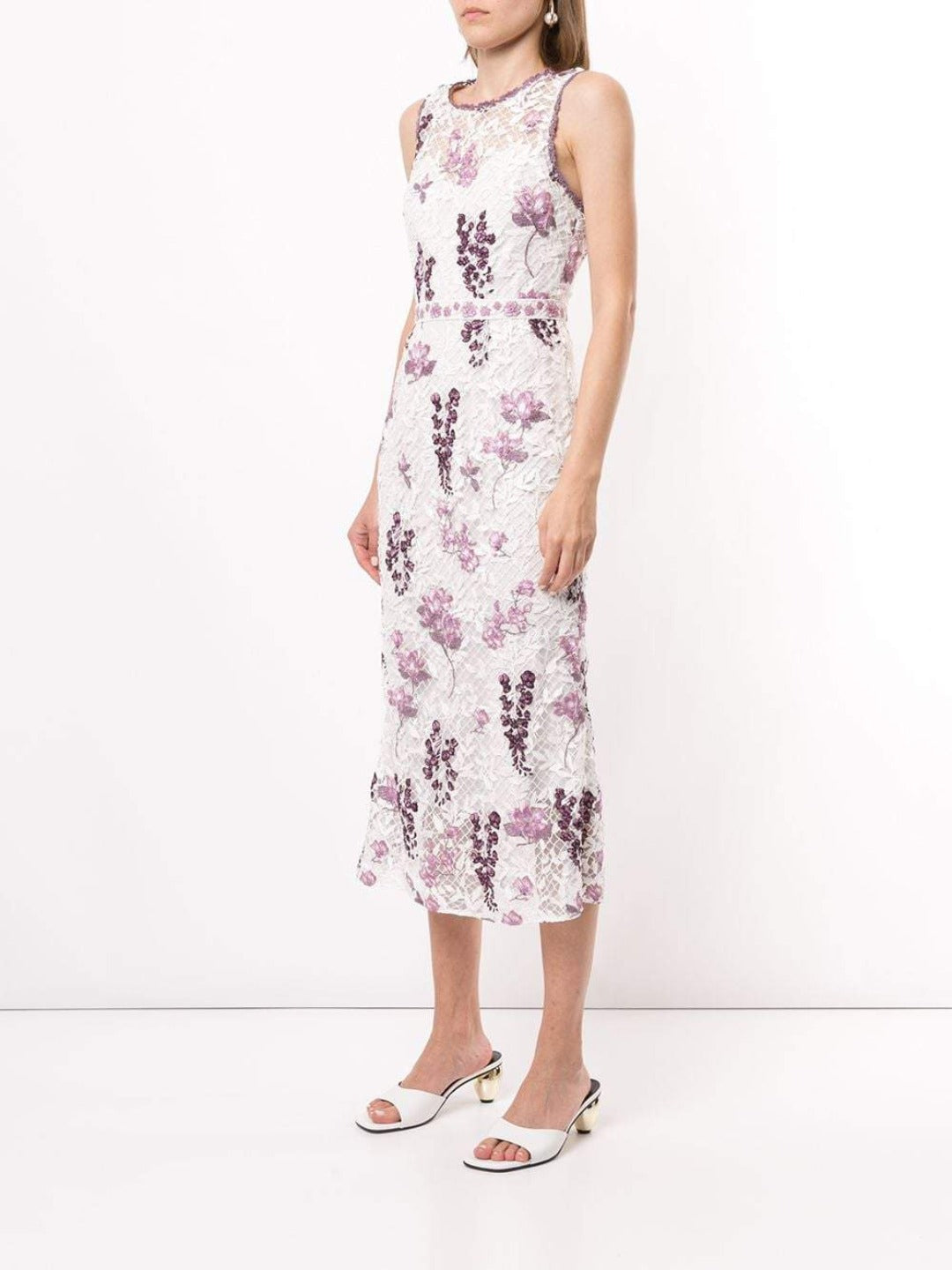 Sleeveless floral guipure tea-length dress in ivory and lilac tones featuring floral embroidery, a round neck, rear zip fastening and a fitted waist.
