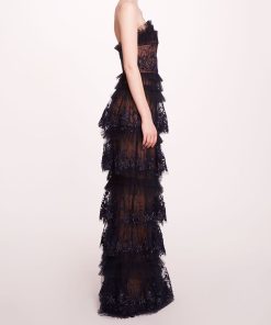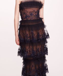 Step into enchanting elegance with the Tiered Terrarium Column Gown, featuring a strapless design adorned with intricate terrarium embroidery on delicate tulle. The ethereal tulle pleated neckline adds a whimsical touch, while the tiered silhouette gracefully flows to create a captivating profile.