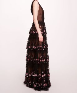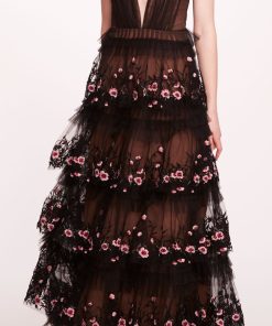 Make a stunning entrance in the Tiered Terrarium V-Neck Gown, featuring a sleeveless design and a dramatic deep v-neckline. The tiered tulle skirt, adorned with intricate terrarium embroidery, adds a whimsical touch to the look.