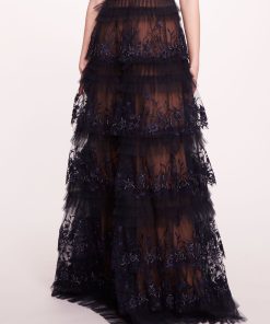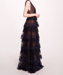 Make a stunning entrance in the Tiered Terrarium V-Neck Gown, featuring a sleeveless design and a dramatic deep v-neckline. The tiered tulle skirt, adorned with intricate terrarium embroidery, adds a whimsical touch to the look.